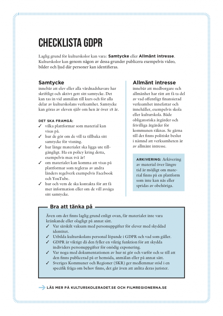 Kulturskolerådet har i samverkan med det nationella nätverket för film i kulturskolan, tagit fram riktlinjer i en checklista för att underlätta kulturskolornas arbete med GDPR.